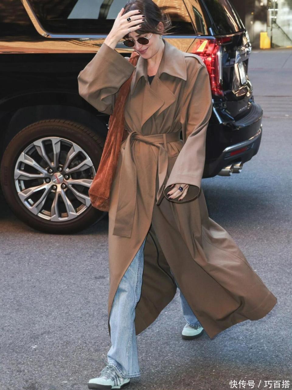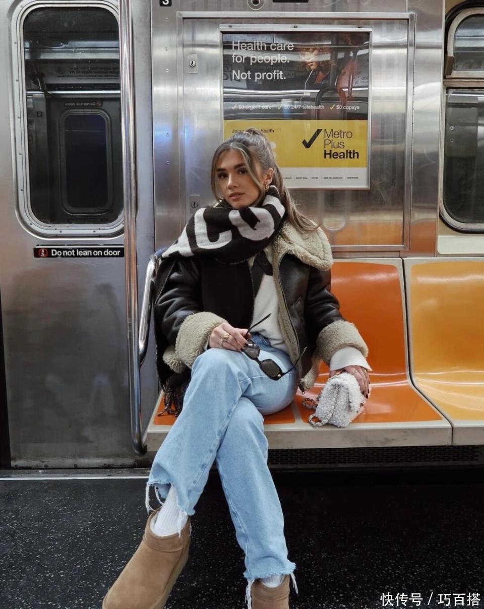 貂皮大衣与水洗蓝牛仔裤搭配,恰好中和了两件单品的氛围,貂皮大衣的重工和华贵与水洗蓝牛仔裤的经典与基础相互衬托,日常外穿轻易不踩雷。